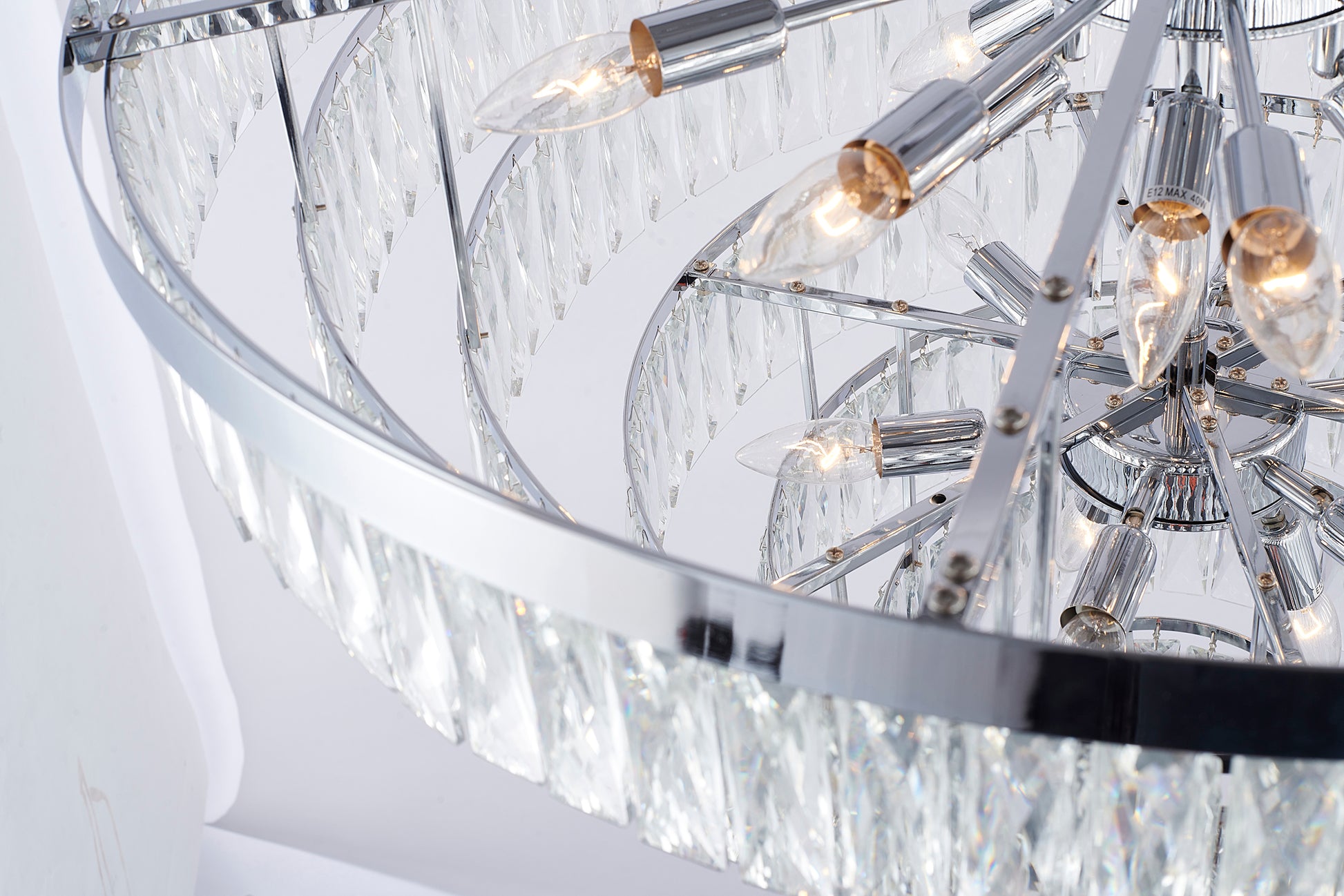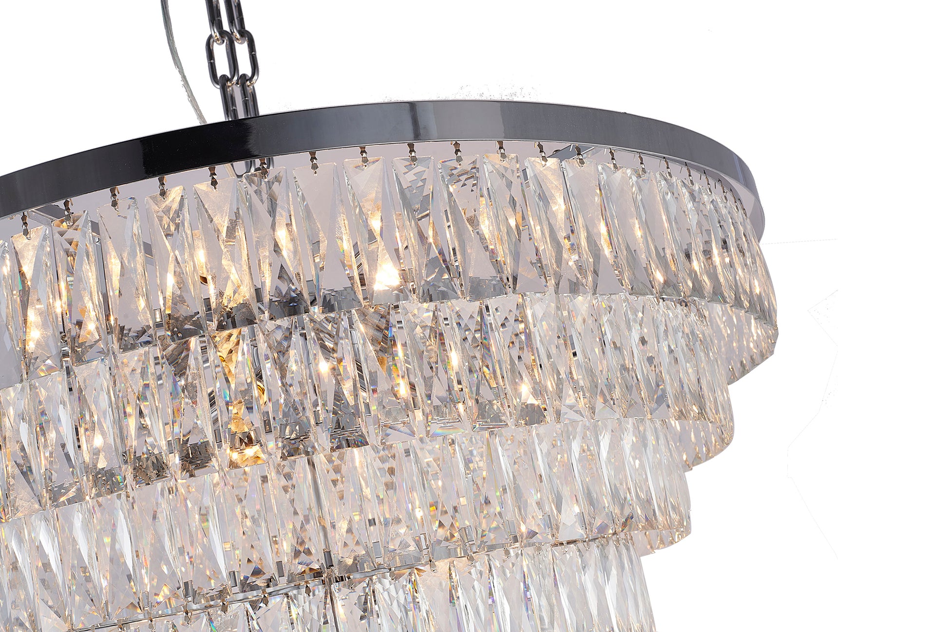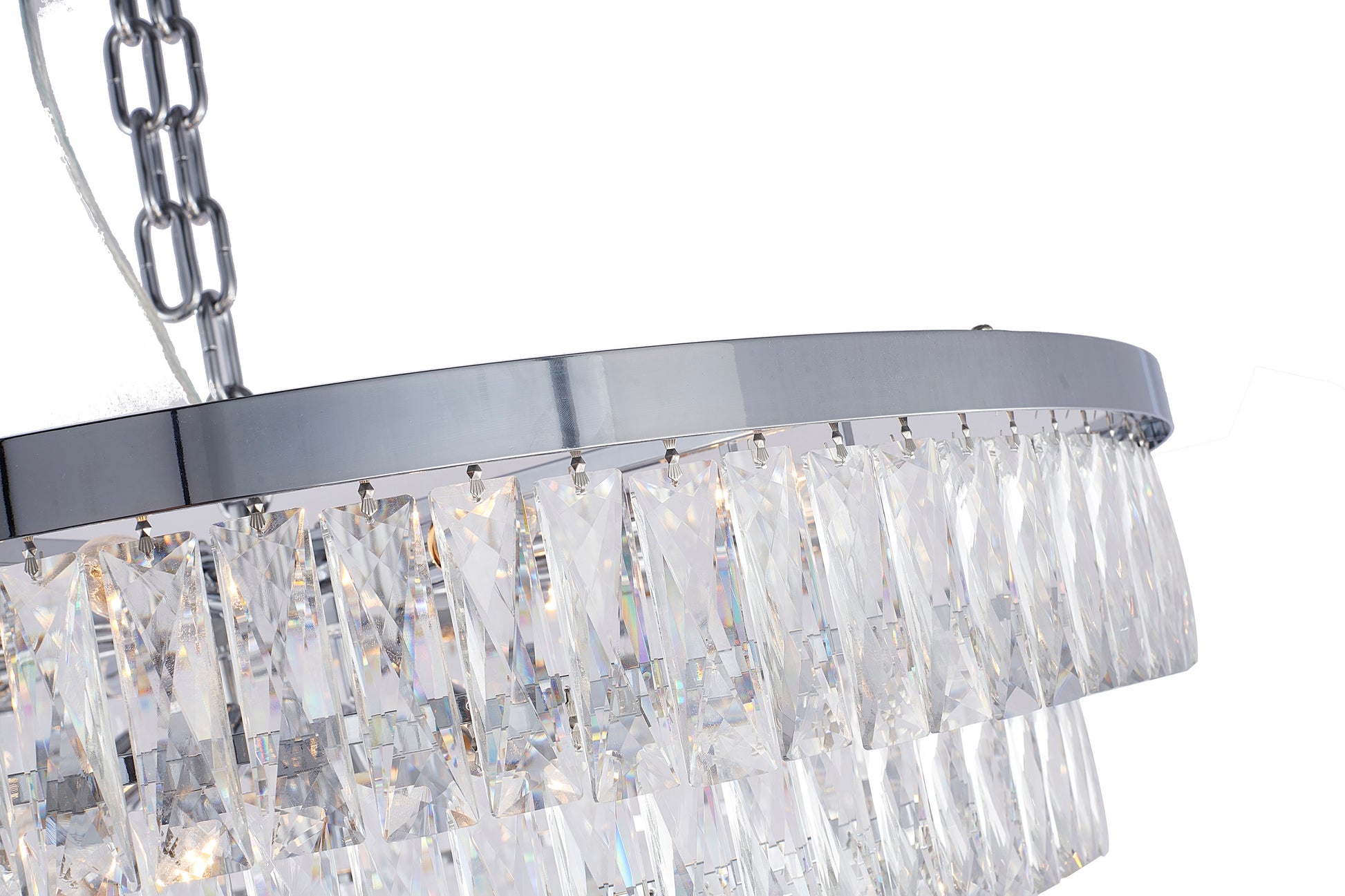Transform your living space into a luxurious oasis with the OC46C36CH chandelier. This stunning eight-tier chandelier features a dazzling chrome finish and a sturdy metal frame adorned with sparkling clear hanging crystals. Easily adjustable chain links add a touch of timeless elegance to your modern aesthetic.